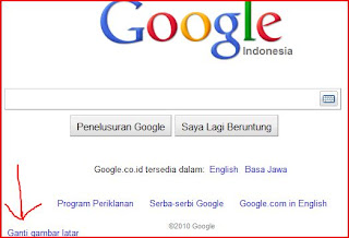 - Lihat bagian kiri bawah dari google (pada tutorial ini kita menggunakan google.co.id) ada tulisan "Ganti gambar latar", klik tulisan tersebut